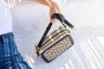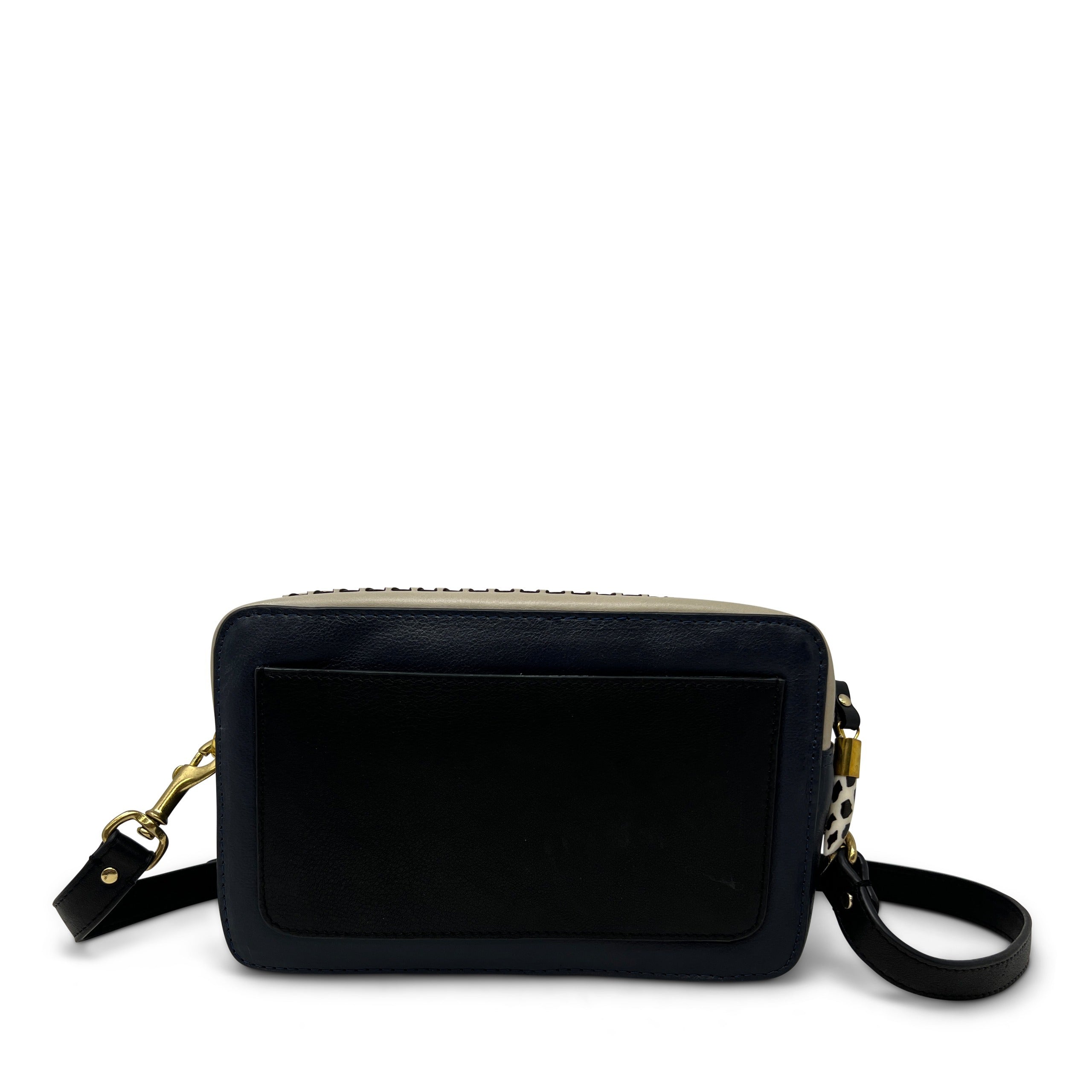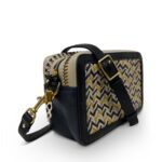 As we dive into the summer season, Kempton & Co. presents a bold and colorful update to the Amberleigh, making it a true showstopper. This iconic silhouette, inspired by vintage travel and classic camera bags, has been reimagined with vibrant, summer-ready details. The Amberleigh now features a striking woven geometric design on one side panel in chalk, black, and yellow leather, while the top showcases a complementary woven pattern in chalk, yellow, black, and pink leather. The sides are crafted from rich navy leather, adding a sophisticated touch, and the back pocket is finished in sleek black leather for a classic contrast.