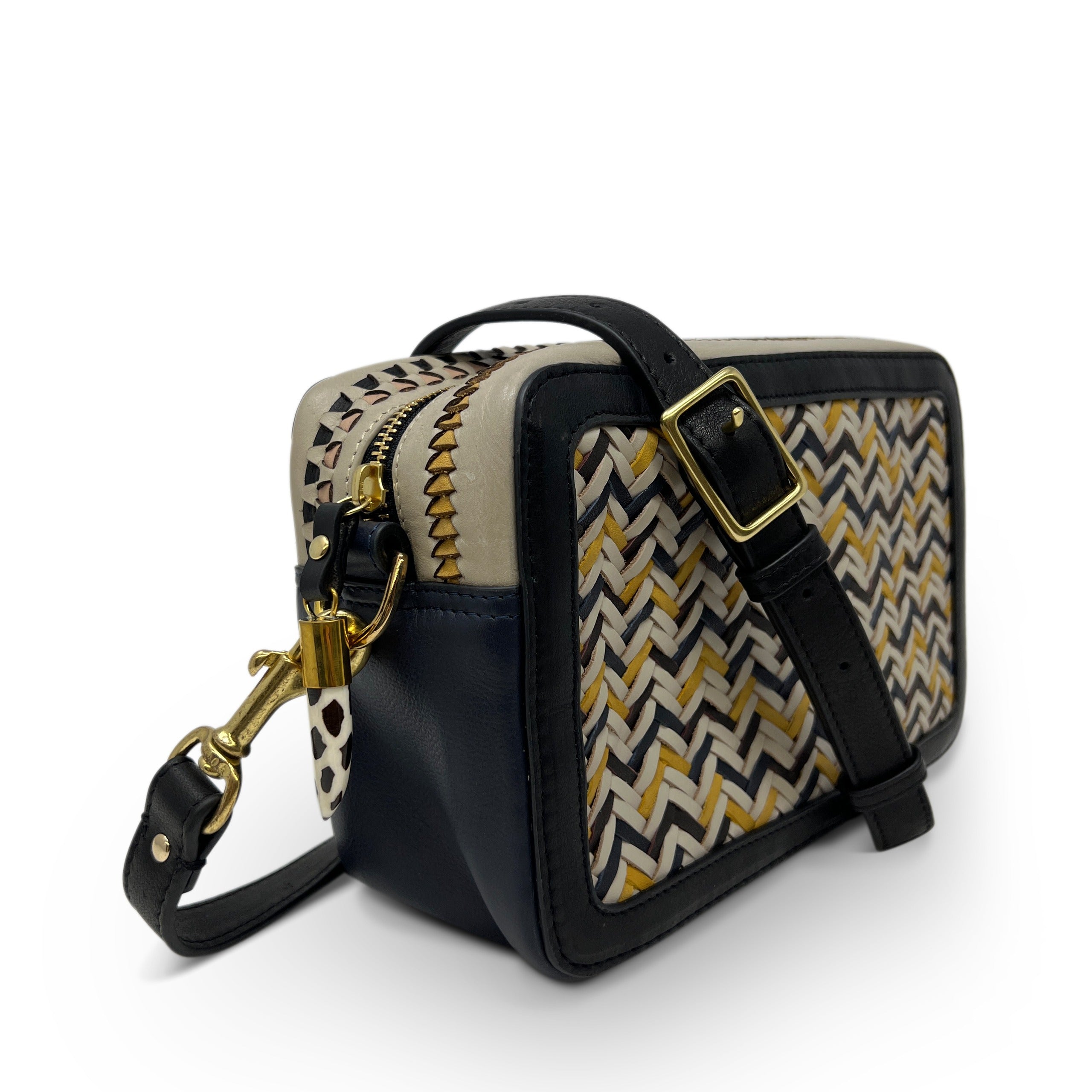 Compact yet spacious, the Amberleigh is thoughtfully designed to keep your essentials?documents, valuables, wallet, and phone?secure and easily accessible, whether you’re on a summer adventure or enjoying an evening out. When a more polished look is in order, simply remove the strap and carry it as an elegant clutch. The dynamic interplay of woven patterns with the deep navy and black leather elements ensures that this bag stands out, effortlessly pairing with everything from laid-back summer outfits to more tailored pieces. The Amberleigh is your perfect companion for blending bold style with everyday functionality this summer.